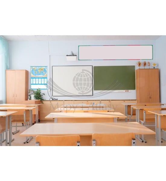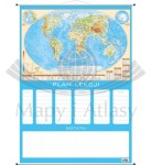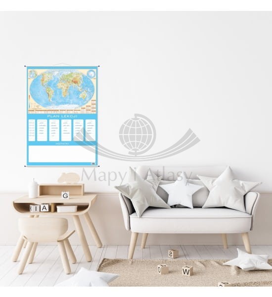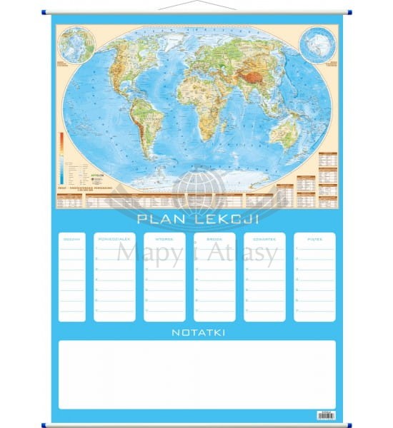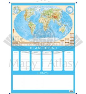 Ścienny plan lekcji z mapą fizyczną świata.