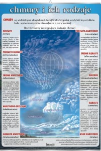 Plansza edukacyjna przedstawiająca graficznie rodzaje chmur wraz z opisami oraz nazwami po łacinie.