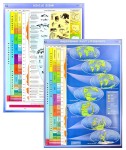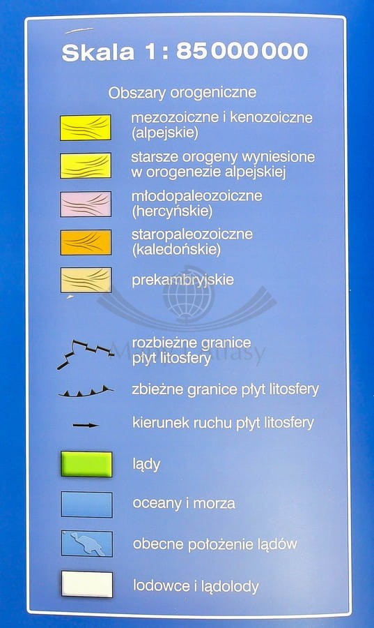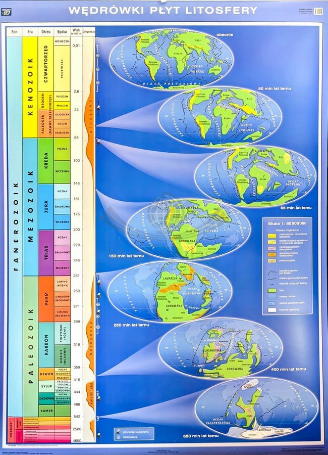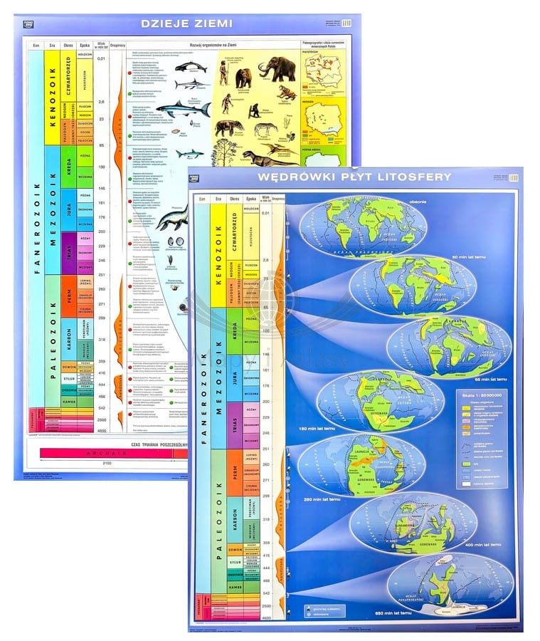 Dwustronna plansza edukacyjna przedstawiająca dzieje Ziemi i wędrówki płyt litosfery. Na pierwszej stronie przedstawiono rozwój organizmów na Ziemi z podziałem na środowisko wodne i lądowe oraz paleografię i złoża surowców mineralnych Polski na tle podziału dziejów Ziemi. Na drugiej stronie przedstawiono wędrówki płyt litosfery na tle podziałów dziejów Ziemi.