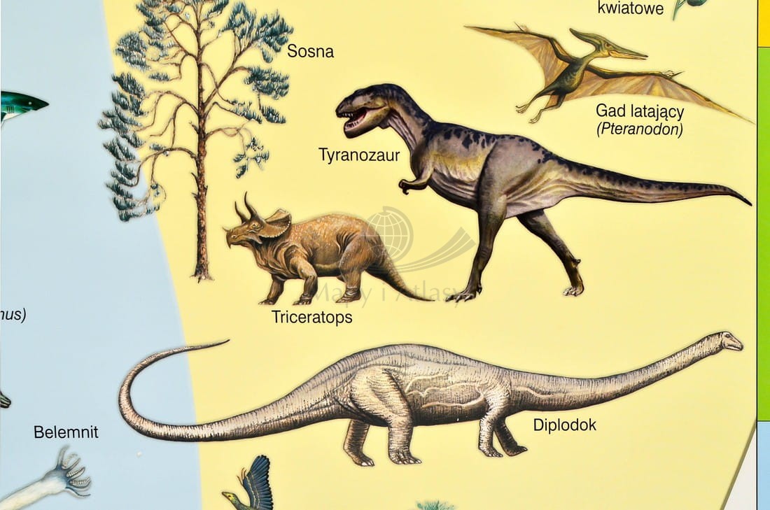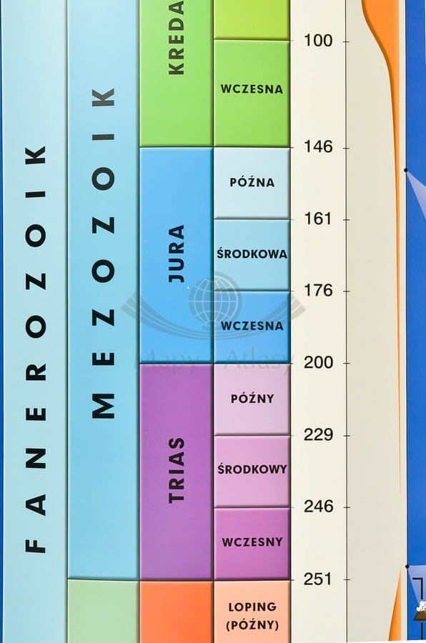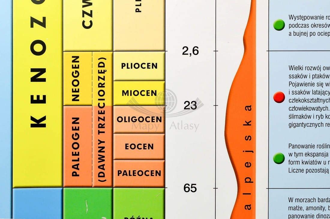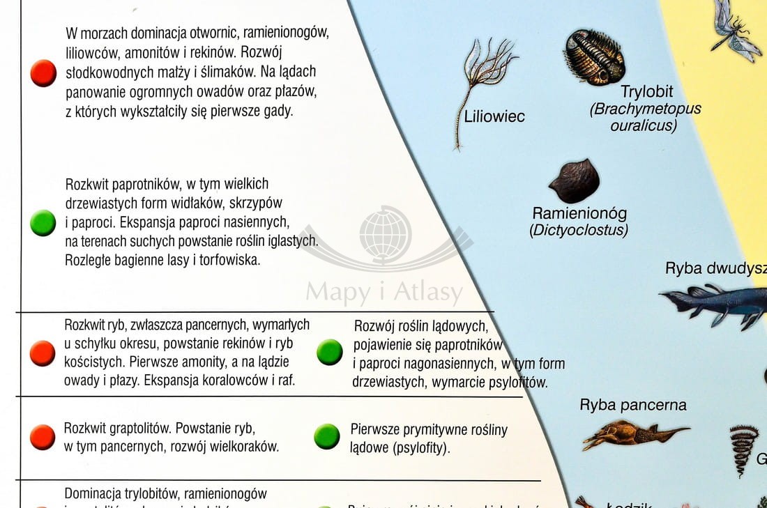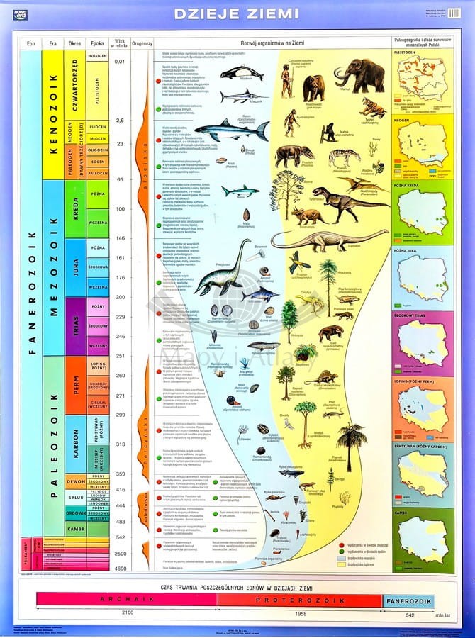 Na pierwszej stronie przedstawiono rozwój organizmów na Ziemi z podziałem na środowisko wodne i lądowe oraz paleografię i złoża surowców mineralnych Polski na tle podziału dziejów Ziemi.