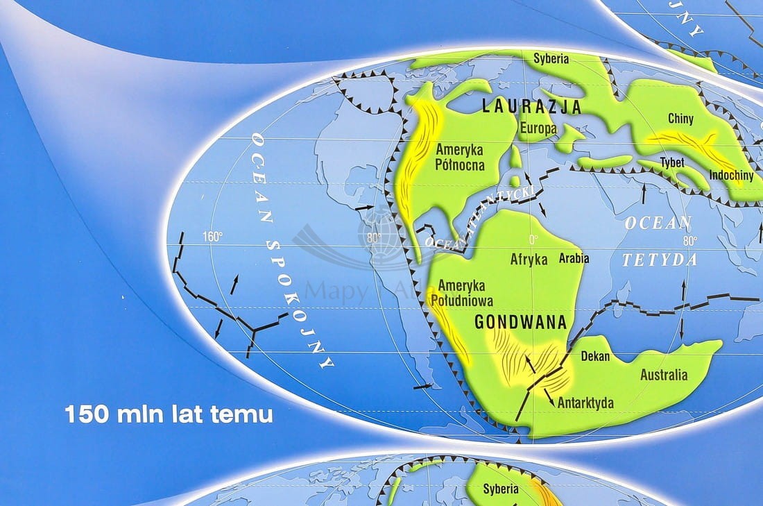 Dwustronna plansza edukacyjna przedstawiająca dzieje Ziemi i wędrówki płyt litosfery.
