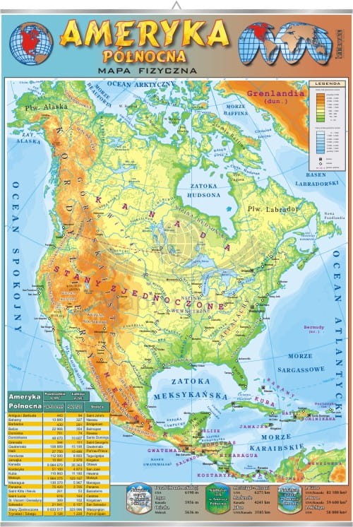 Plansza edukacyjna przedstawiająca mapę fizyczną Ameryki Północnej. Zawiera również informacje dotyczące powierzchni, liczby ludności oraz stolicy poszczególnych państw tego kontynentu.
