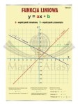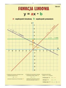 Plansza edukacyjna przedstawiająca wykres funkcji liniowej, współczynnik kierunkowy, współczynnik przesunięcia, monotoniczność funkcji (rosnąca, stała, malejąca).