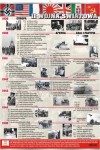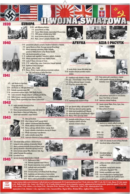 Plansza edukacyjna przedstawiająca najważniejsze wydarzenia II wojny światowej z podziałem na Europę, Afrykę oraz Azję i Pacyfik.