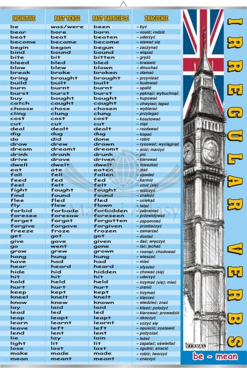 Plansza edukacyjna przedstawiająca odmianę czasowników nieregularnych języka angielskiego - część pierwszą (od ,,be" do ,,mean").