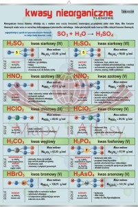 Plansza edukacyjna przedstawiająca najczęściej omawiane w szkołach przykłady kwasów nieorganicznych tlenowych. Na opis poszczególnych kwasów składa się: wzór sumaryczny, nazwa, wzór strukturalny, masa molowa, przykłady soli oraz właściwości fizyczne i chemiczne.
