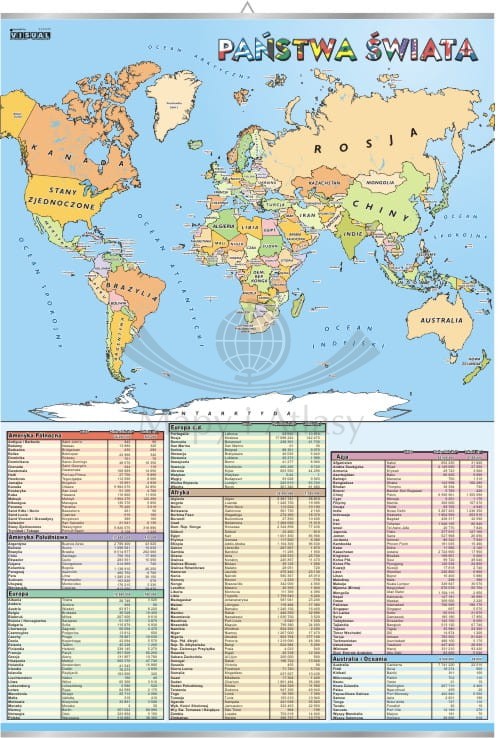 Plansza edukacyjna przedstawiająca państwa świata. Zawiera również informacje dotyczące powierzchni, liczby ludności oraz stolicy państw poszczególnych kontynentów.