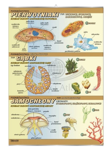 Plansza edukacyjna przedstawiająca na schematach budowę anatomiczną pierwotniaków (na przykładzie pantofelka), gąbek oraz jamochłonów (na przykładzie meduzy) wraz z przykładami poszczególnych typów.