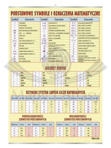 Plansza edukacyjna przedstawiająca, podstawowe symbole i oznaczenia matematyczne: alfabet grecki, rzymski system zapisu liczb naturalnych, podwielokrotności jednostek podstawowych, wielokrotności jednostek...