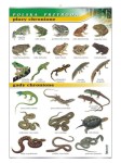 Plansza edukacyjna przedstawiająca 15 gatunków płazów i 9 gatunków gadów chronionych występujących w Polsce.