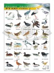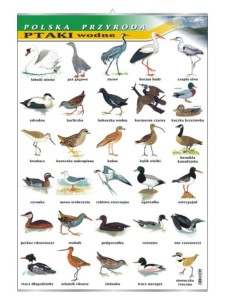 Plansza edukacyjna przedstawiająca 30 gatunków ptaków wodnych występujących w Polsce.
