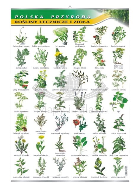 Plansza edukacyjna przedstawiająca 42 roślin leczniczych i ziół występujących w Polsce.