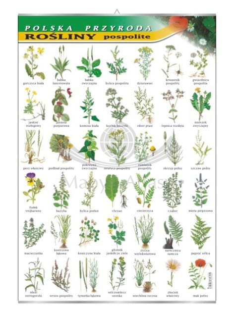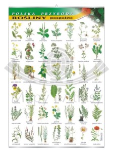 Plansza edukacyjna przedstawiająca 42 rośliny pospolite występujące w Polsce.