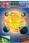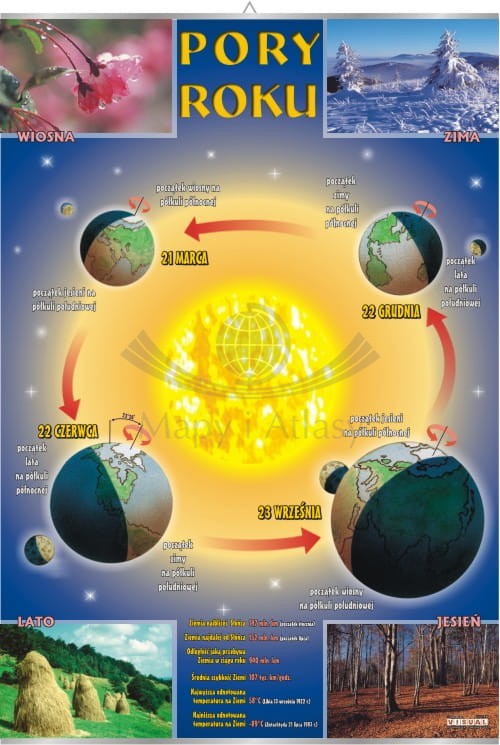 Plansza edukacyjna przedstawiająca schemat powstawania pór roku. Dodatkowo zamieszczono takie informacje jak: odległość jaką przebywa Ziemia w ciągu roku, średnia szybkość Ziemi czy najwyższa odnotowana temperatura na Ziemi.