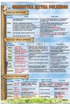 Plansza edukacyjna przedstawiająca części dopełnień, rodzaje okoliczników oraz rodzaje przydawek wraz z przykładami i uwagami.