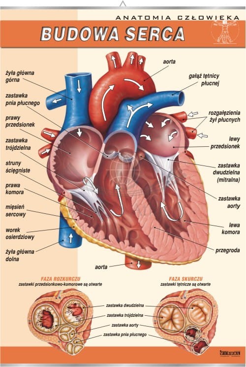 Plansza edukacyjna przedstawiająca schemat budowy serca ludzkiego wraz z kierunkami przepływu krwi. Zawiera również ilustracje obrazujące fazę rozkurczu i skurczu serca.