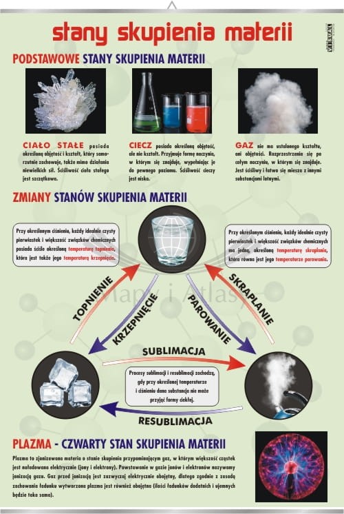 Plansza edukacyjna przedstawiająca podstawowe stany skupienia materii wraz z krótkim opisem, schemat zmian stanów skupienia oraz definicję i opis czwartego stanu skupienia: plazmy.