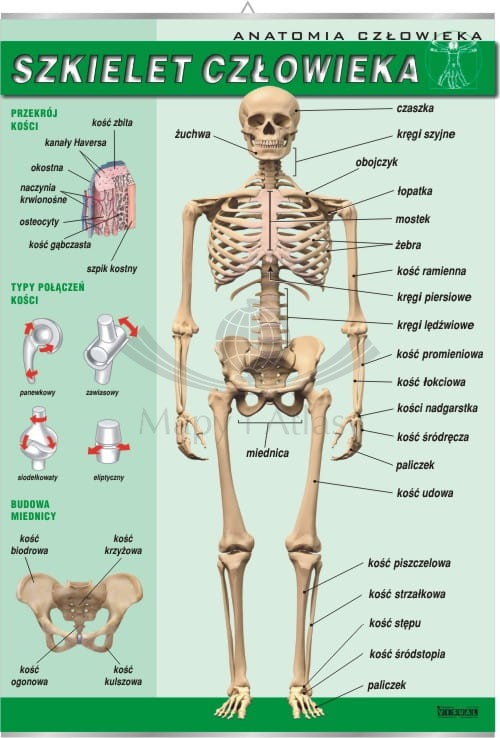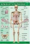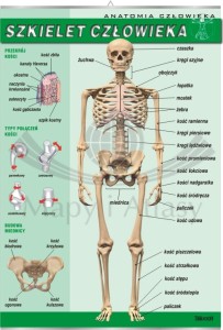 Plansza edukacyjna przedstawiająca schemat budowy szkieletu człowieka. Zawiera również schemat przekroju kości, typy połączeń kości oraz schemat budowy miednicy.