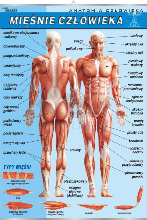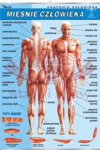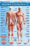 Plansza edukacyjna przedstawiająca budowę układu mięśniowego człowieka. Zawiera również ilustracje typów mięśni.