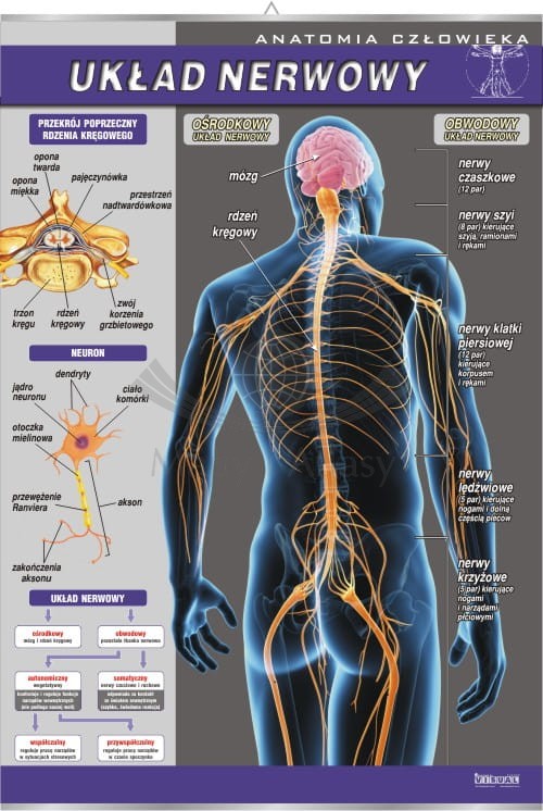 Plansza edukacyjna przedstawiająca za pomocą schematu układ nerwowy człowieka z podziałem na ośrodkowy i obwodowy układ nerwowy. Zawiera także schemat przekroju poprzecznego rdzenia kręgowego oraz schemat budowy neuronu.