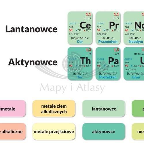 Plansza edukacyjna układ okresowy pierwiastków w formacie 100 x 70 cm. Zawiera takie informacje jak: nazwę pierwiastka w języku polskim, masę atomową, masę molową, energię jonizacji, gęstość pierwiastka, konfigurację elektronową...