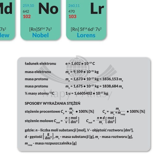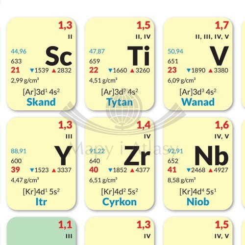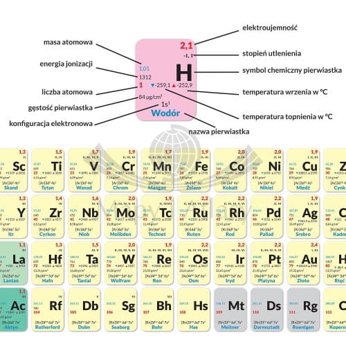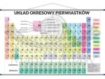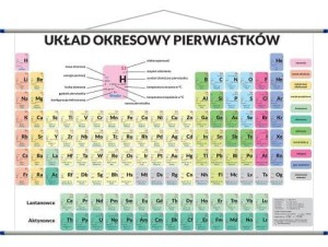 Plansza edukacyjna Układ Okresowy Pierwiastków 146 x100 cm zawiera takie informacje jak: nazwę pierwiastka w języku polskim, masę atomową, masę molową, energię jonizacji, gęstość pierwiastka, konfigurację elektronową, elektroujemność, stopień utleniania...