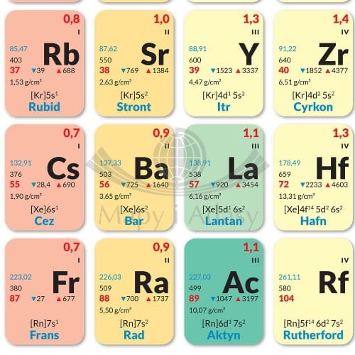 Plansza edukacyjna Układ Okresowy Pierwiastków 214 x140 cm zawiera takie informacje jak: nazwę pierwiastka w języku polskim, masę atomową, masę molową, energię jonizacji, gęstość pierwiastka, konfigurację elektronową, elektroujemność, stopień utleniania...