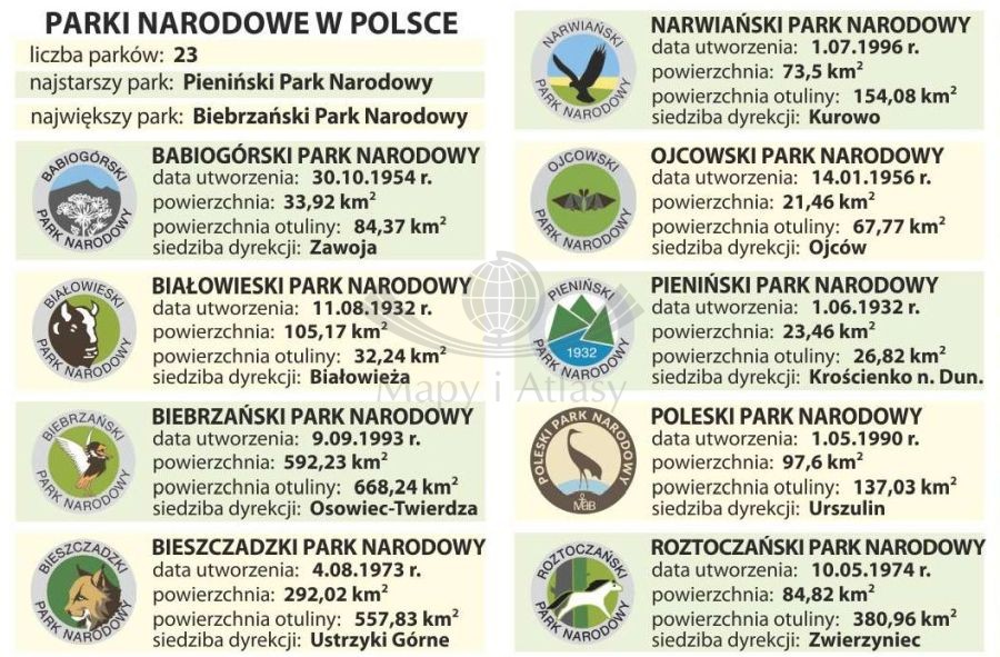 - podstawowe dane liczbowe oraz godła poszczególnych województw.