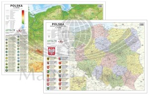 Laminowana, dwustronna podkładka (mapa podręczna) z mapą fizyczną i administracyjną Polski.