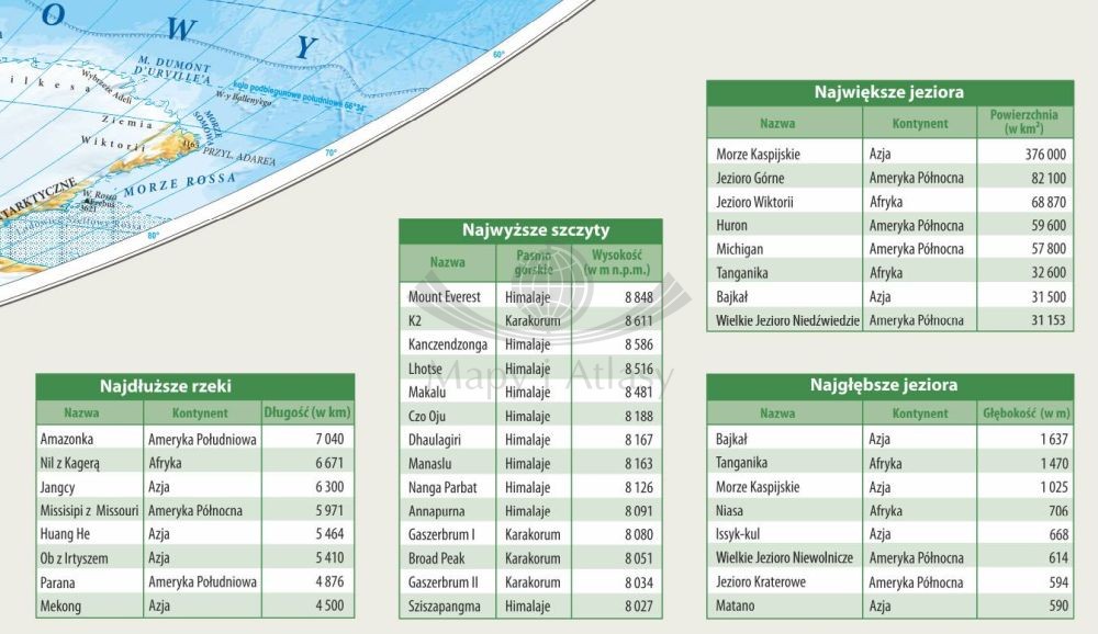 Strona fizyczna dodatkowo zawiera informacje o oceanach, kontynentach, największych wyspach, pustyniach i jeziorach, oraz najdłuższych rzekach, najwyższych szczytach i najgłębszych jeziorach.