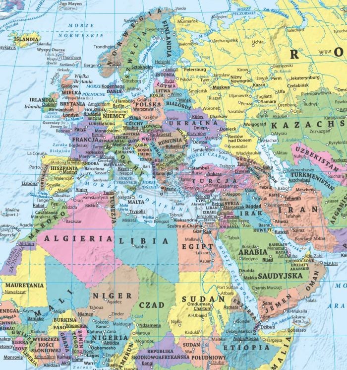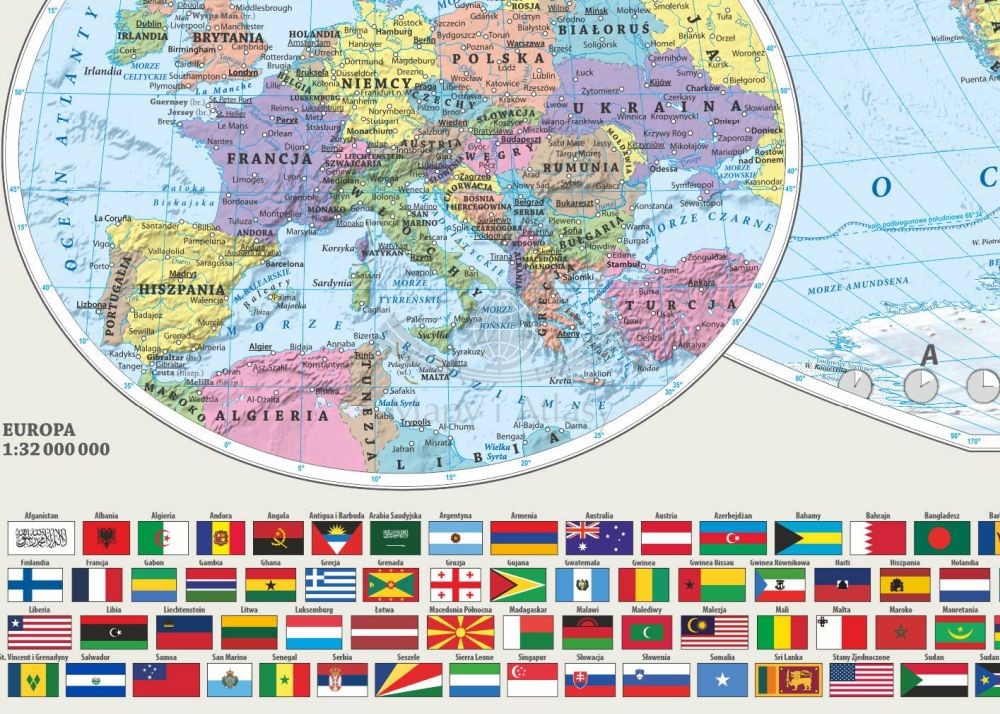 Strona polityczna zawiera dodatkowo: flagi państwa oraz mapę Europy w skali 1:32 000 000.