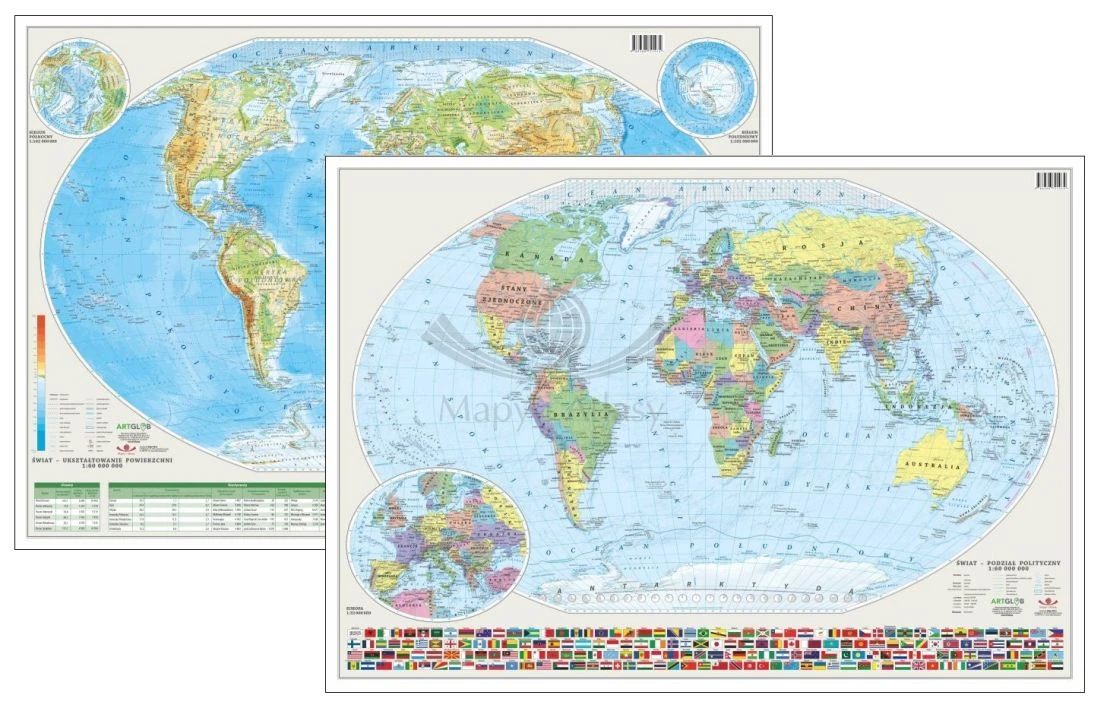 Laminowana, dwustronna podkładka (mapa podręczna) z mapą fizyczną i polityczną świata.