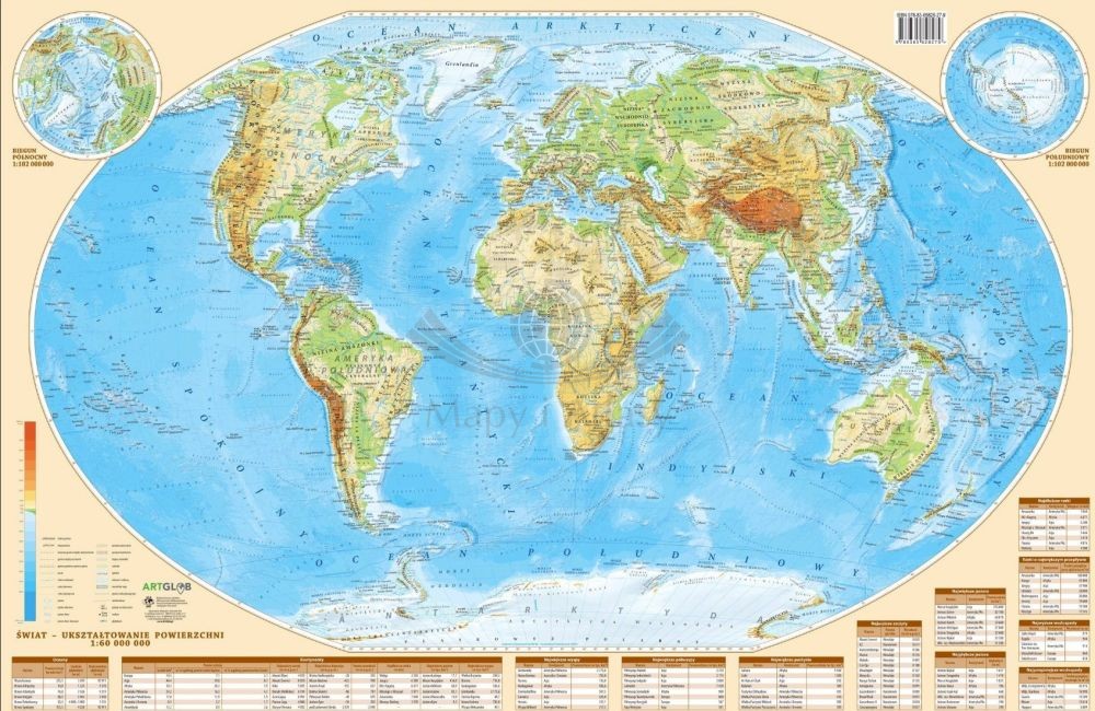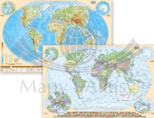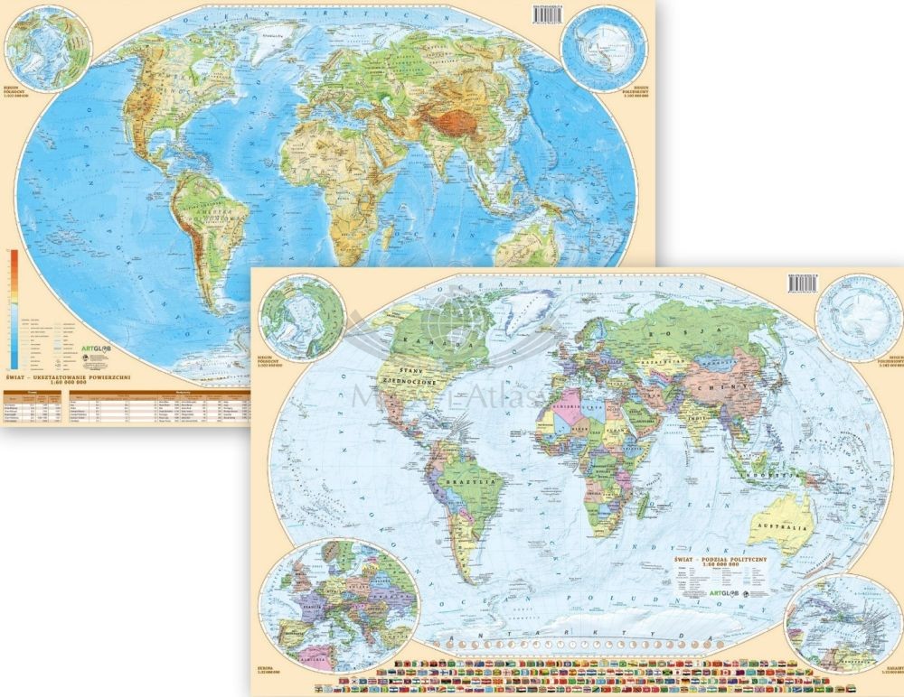 Dwustronna podkładka na biurko z mapą świata w skali 1:60 000 000, polityczną (awers) oraz fizyczną (rewers) wydawnictwa ArtGlob.