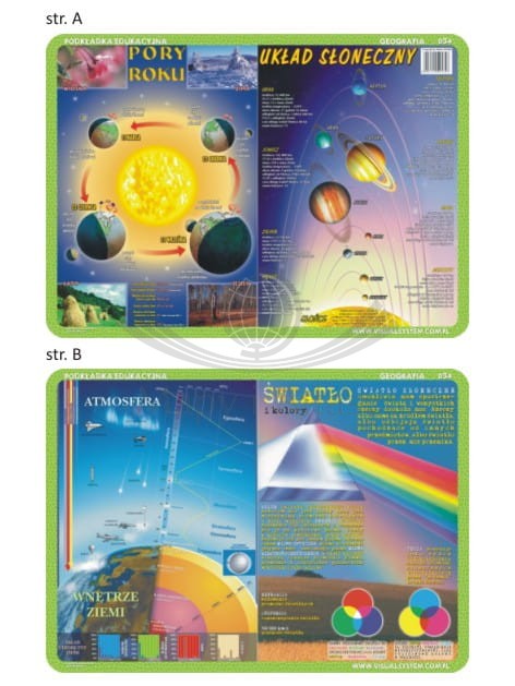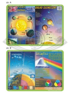 Dwustronna podkładka edukacyjna. Na pierwszej stronie zamieszczono schemat powstawania pór roku oraz Układ Słoneczny. Na drugiej stronie przedstawiono poszczególne warstwy atmosfery i wnętrza Ziemi oraz podstawowe informacje dotyczące światła słonecznego i zjawiska rozszczepienia światła.
