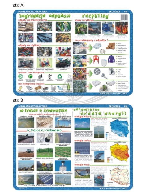 Segregacja odpadów, recykling, odnawialne źródła energii, środowisko. Dwustronna podkładka edukacyjna 018