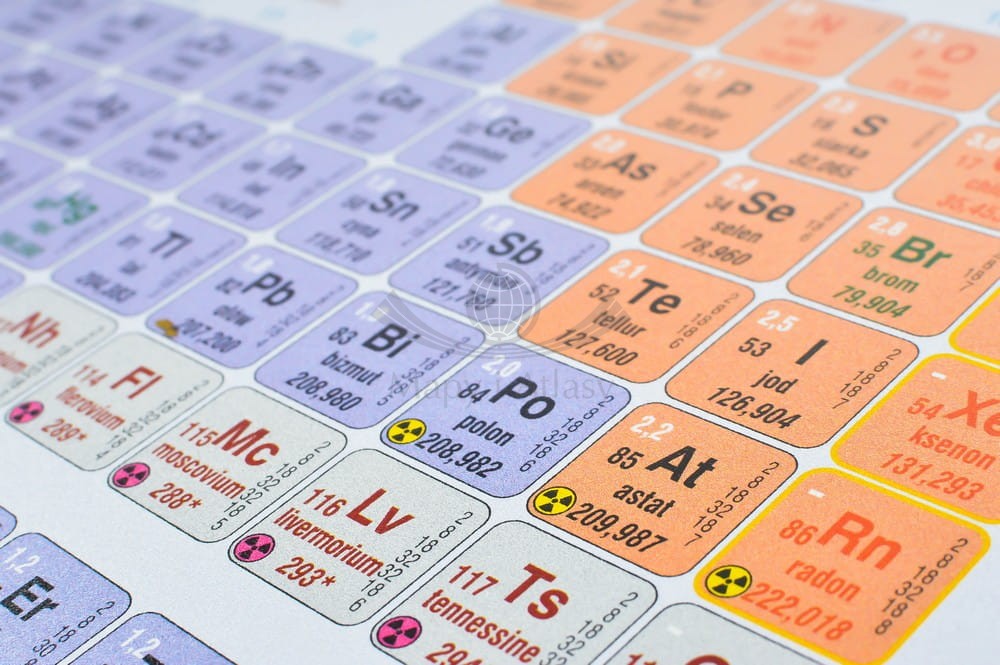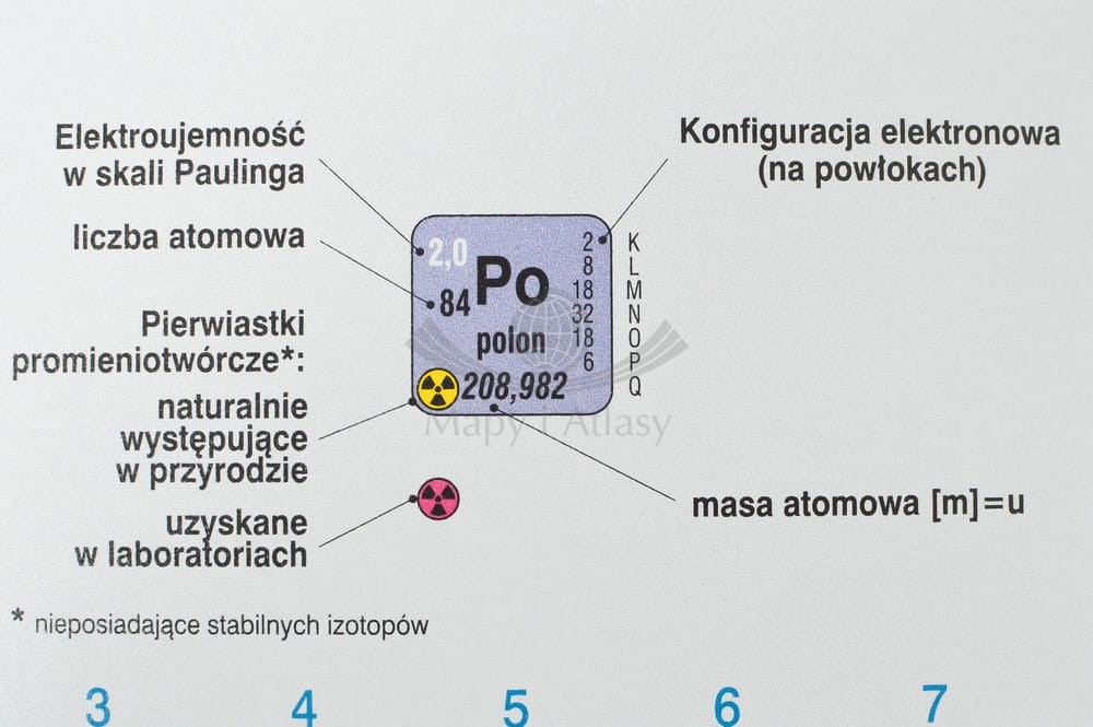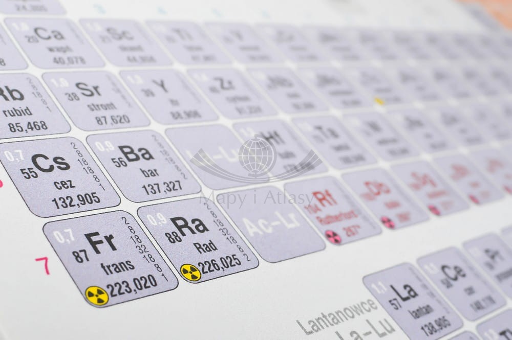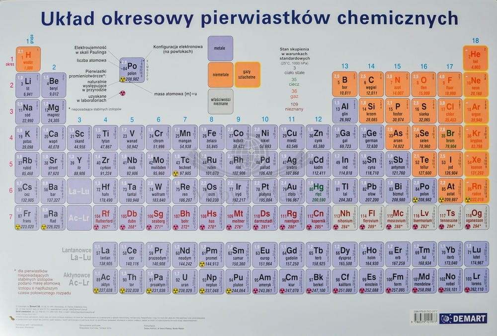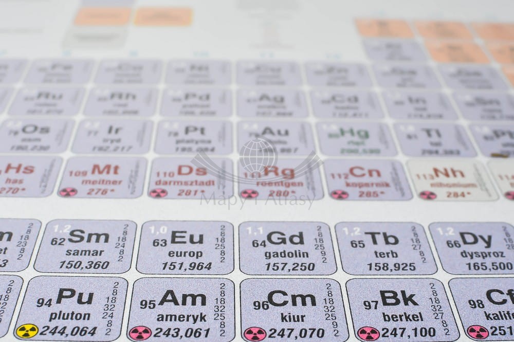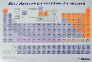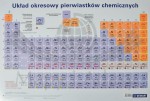 Podkładka na biurko z czytelnym rysunkiem układu okresowego z podziałem na grupy i okresy oraz z wieloma innymi danymi. Informacje podstawowe: symbol, nazwa polska, liczba atomowa, masa atomowa oraz zaawansowane: konfiguracja elektronowa na powłokach głównych, elektroujemność w skali Paulinga.