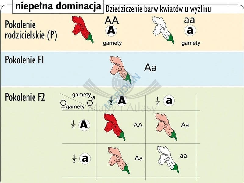 Ścienna plansza edukacyjna do biologii przedstawiająca przystępnie prawa Mendla. Zilustrowany jest proces dziedziczenia barw kwiatów u grochu z pełną dominacją oraz u kwiatów wyżlinu z niepełną dominacją...