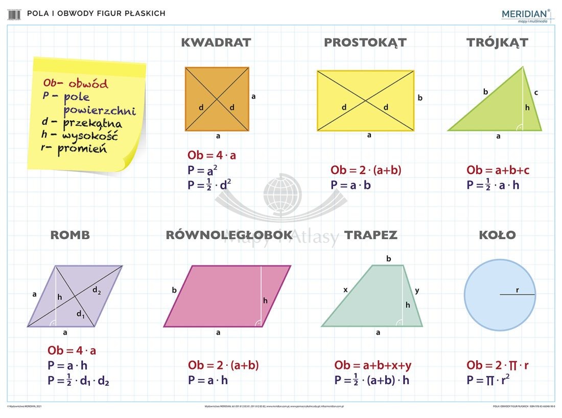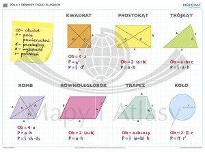Ścienna plansza edukacyjna do matematyki przedstawiająca pola i obwody figur płaskich. Wymiar planszy: 200 x 150 cm.