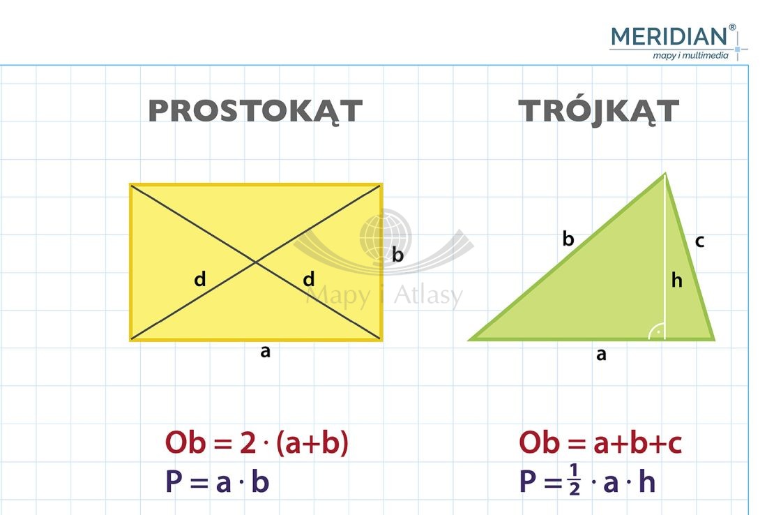 Pola i obwody figur płaskich. Plansza edukacyjna 200 x 150 cm. Drewniane półwałki