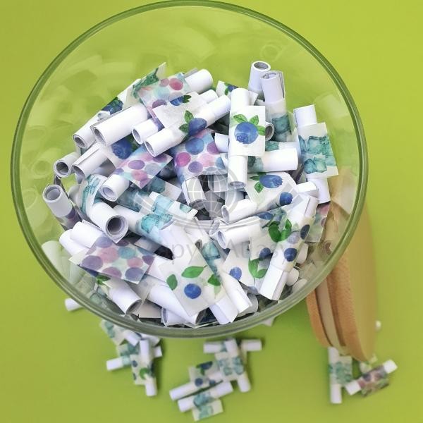 Każda myśl zwinięta jest ręcznie w osobnej, zadrukowanej karteczce, otulonej dekoracyjną tasiemką.