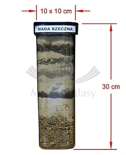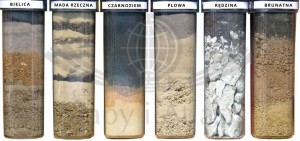 Zestaw sześciu zamkniętych i opisanych słojów z PCV, zawierających naturalne, wyskalowane warstwy prezentujące przekroje sześciu najpopularniejszych gleb występujących w Polsce. W kolejności, pod względem obszaru występowania na terenie naszego kraju są to: gleba płowa, gleba bielicowa, gleba brunatna, mada rzeczna, rędzina, czarnoziem.