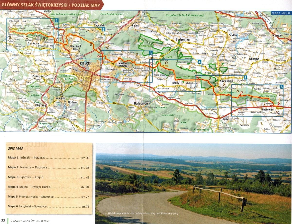 - szczegółową mapę szlaku w skali 1:50 000, podzielonego na 6 odcinków (plus 4 odcinki Szlaku dwóch zamków),