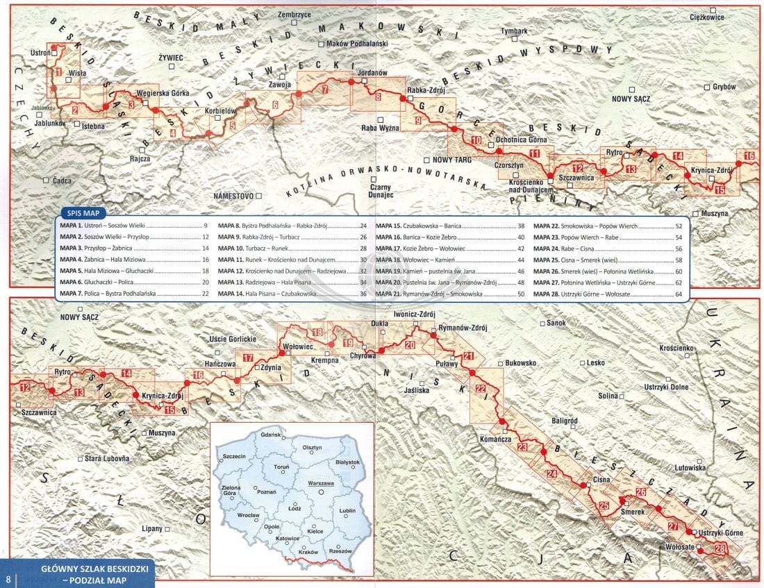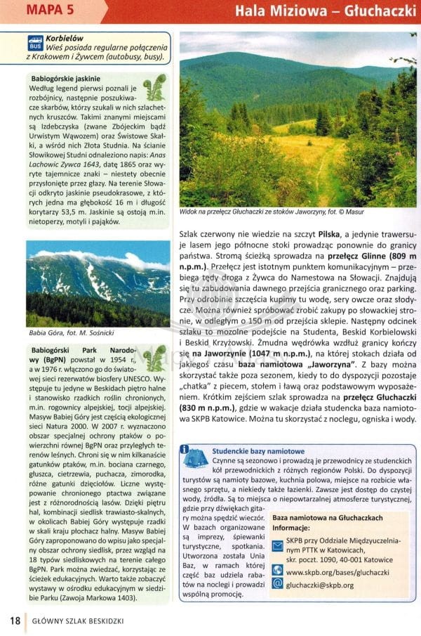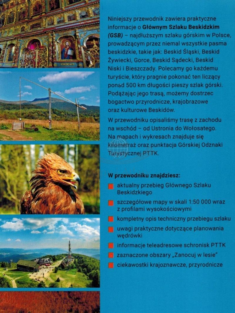 Publikacja zawiera praktyczne informacje o Głównym Szlaku Beskidzkim (GSB), czyli najdłuższym szlaku górskim w Polsce, który prowadzi przez niemal wszystkie pasma beskidzkie (Beskid Śląski, Żywiecki, Gorce, Beskid Sądecki, Niski i Bieszczady).