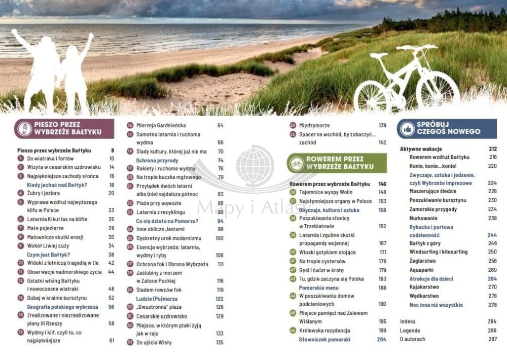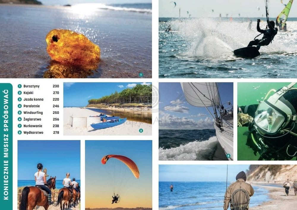 Wybrzeże Bałtyku, to - obok gór Polski południowej i pasa pojezierzy - jeden z trzech najbardziej popularnych wśród turystów regionów naszego kraju. Oczywiście jego największą atrakcję stanowi morze oraz wszystko to, co się z nim nierozerwalnie wiąże - krajobrazy, piaszczyste plaże, porośnięte sosnami wydmy, siedliska ptaków, urwiste klify... Z unikatową przyrodą nierozerwalnie splotły się tu dzieła rąk ludzkich - latarnie morskie, dawne umocnienia militarne, mola, porty rybackie. W nadmorskich miasteczkach nie brakuje zabytków i muzeów, a we wsiach świadectw kultury materialnej tutejszych ludów - Wolinian, Słowińców, Kaszubów czy żuławskich Olędrów. Niezależnie od pogody, nad Bałtykiem na pewno nie będziemy się nudzić. Można tu (oczywiście!) plażować i uprawiać rozmaite sporty wodne. Można też spacerować i realizować dłuższe wycieczki piesze i rowerowe, a także spróbować swych sił w jeździe konnej, lotach paralotnią lub wypłynąć w morski rejs.