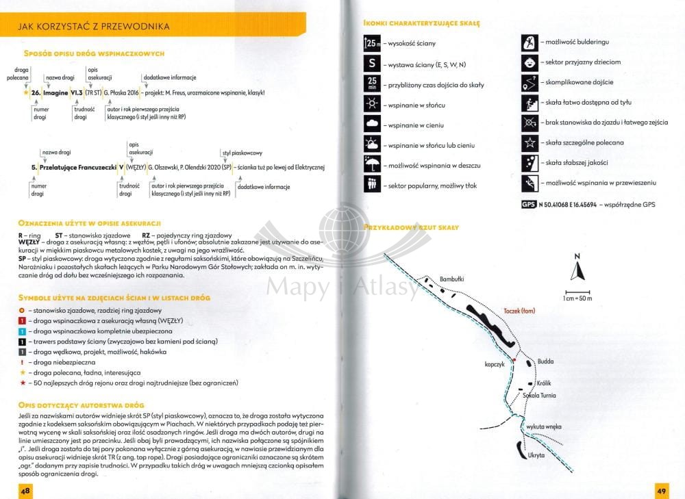 Przewodnik wspinaczkowy po rejonie Szczytnej w Górach Stołowych autorstwa Michała Kajca.