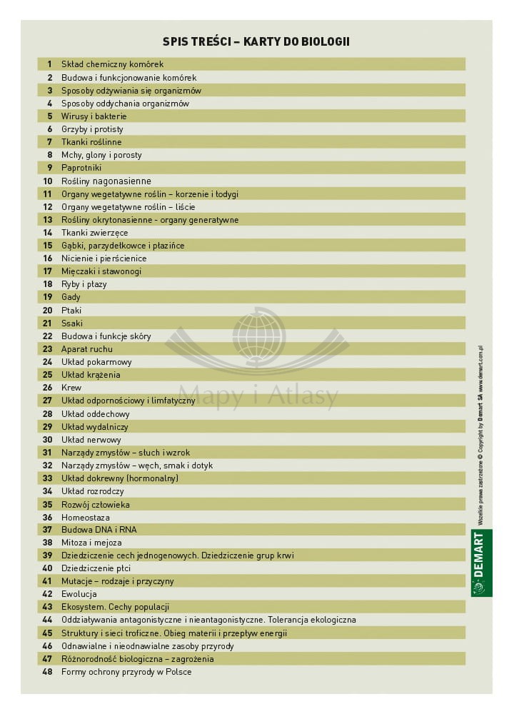 Ściągi, karty edukacyjne do biologii dla klas 5-8 wydawnictwa Demart.