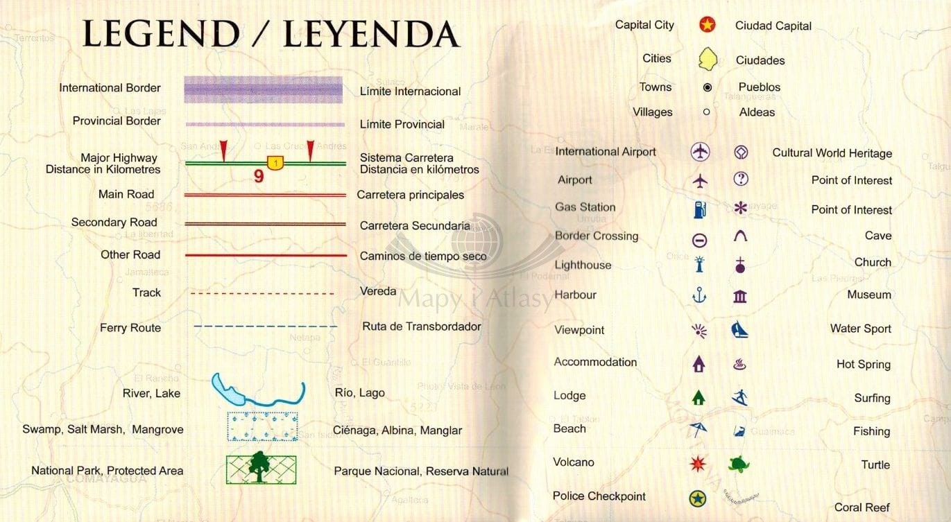 Składana, dwustronna, wodoodporna mapa samochodowo-turystyczna Nikaragui i Hondurasu w skali 1:700 000 wydawnictwa ITMB.