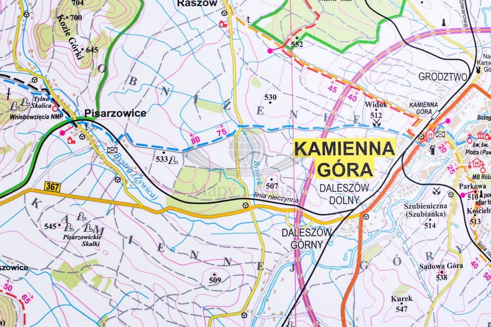Na mapie zaznaczono m.in.: