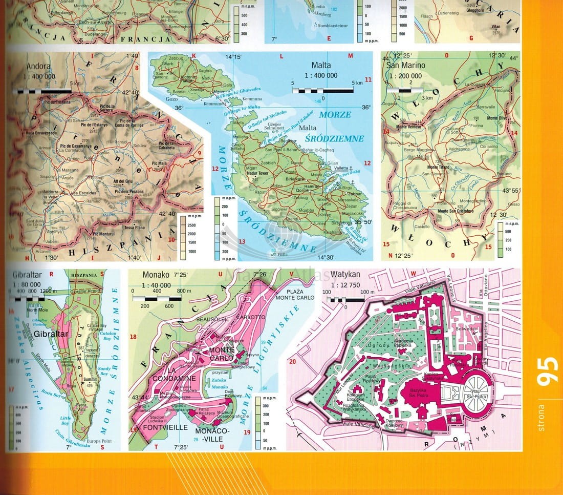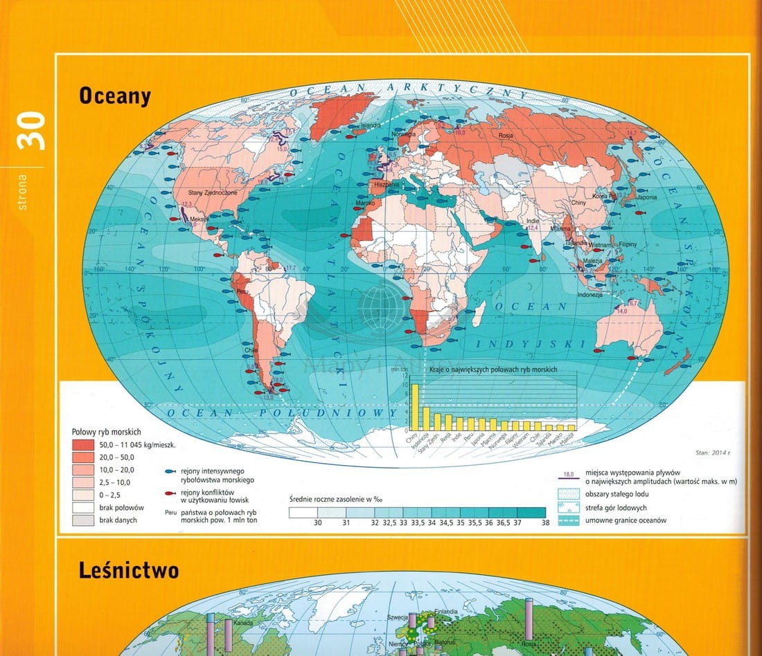 Pokaźny atlas otwierają mapy i kolorowe tablice dotyczące świata. O ich aktualności świadczy np. przedstawienie wartości PKB pokazujące rosnącą potęgę Chin i Niemiec, przy zmniejszającym się udziale dotychczasowych przodujących gospodarek Stanów Zjednoczonych i Japonii. Z kolei, analizując kolejną mapę, można zaobserwować wyraźną tendencję do wyrównywania liczby ludności Chin i Indii (chociażby w stosunku do danych sprzed kilku lat), a nawet zabawić się w prognozy na podstawie wartości przyrostu naturalnego.