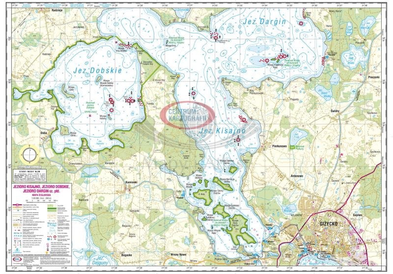Mapa obejmuje głównie jeziora: Kisajno, Dobskie i Dargin - część południowa. Dodatkowo w zasięgu mapy znalazły się jeziora: Dejguny, Dziewiszewskie, Sztynorskie (część południowa), Dgał Mały i Wielki, Warniak, Skarż Wielki, Fryd, Wojsak, Popówko i wyjście z Jeziora Niegocin, kanałem przez Giżycko do Zatoki Tracz.